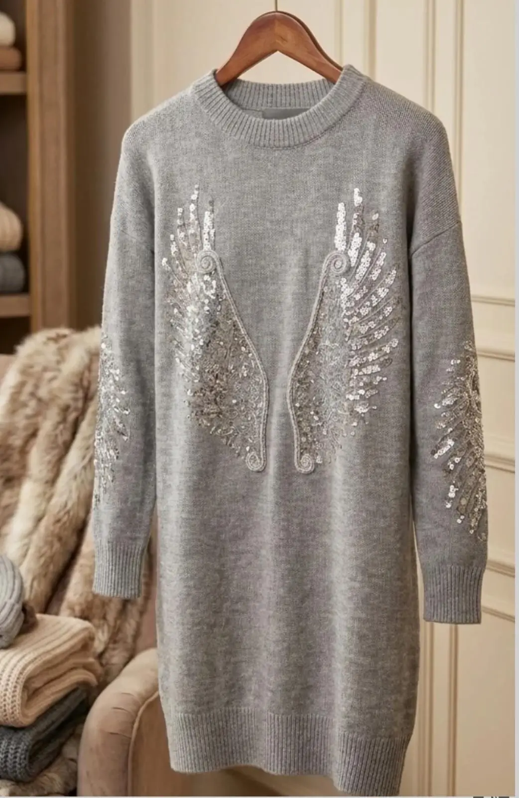 Elegant Sequin Wing Design – This stylish knit dress features a beautiful sequin wing-inspired embellishment on the front and sleeves, adding a touch of sparkle and artistic elegance.